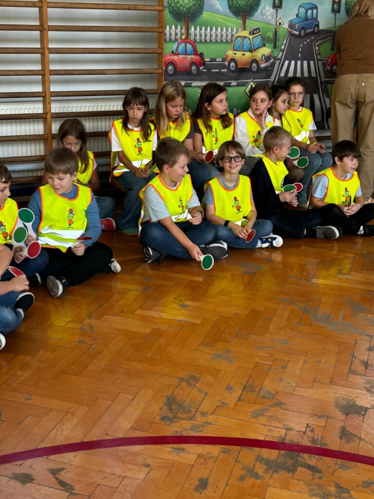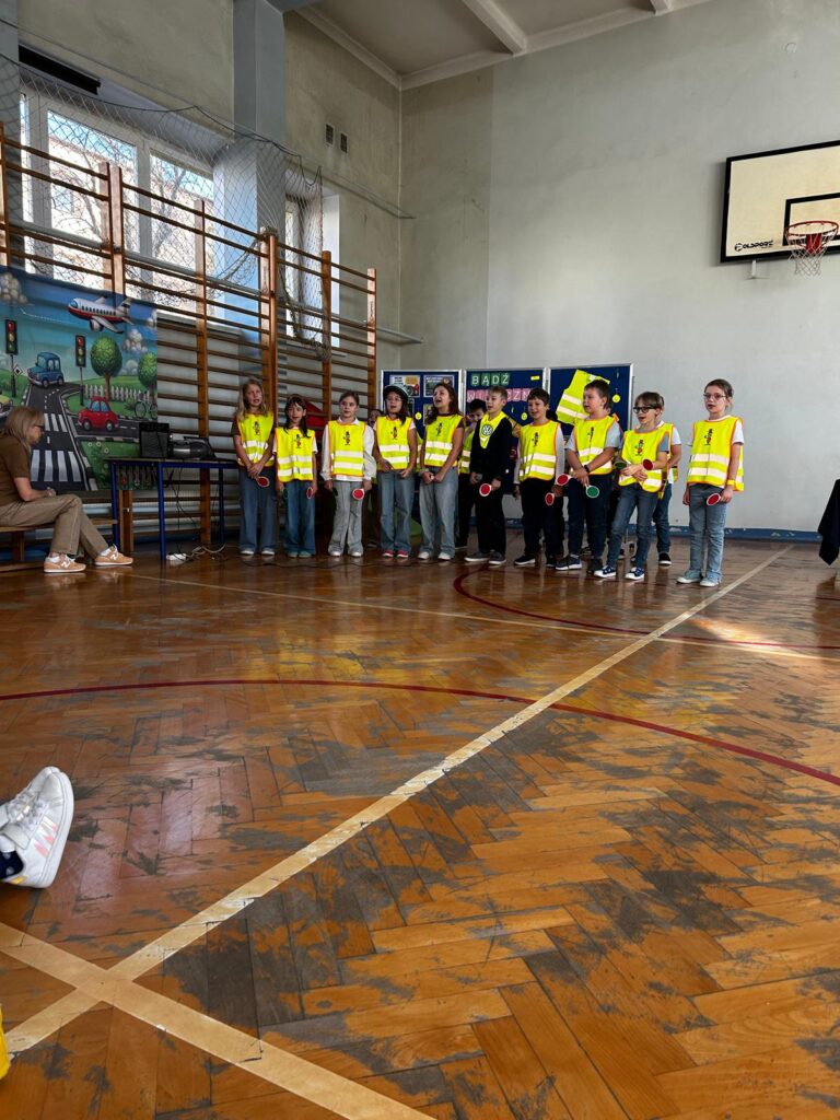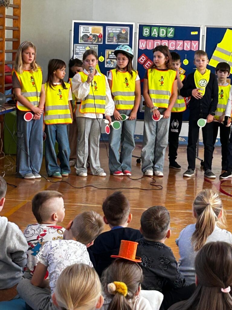 Podczas spotkania uczniowie klasy 3 przygotowali ciekawą inscenizację o zasadach bezpiecznego poruszania się po drodze, przypominając wszystkim, jak ważne jest noszenie elementów odblaskowych.
