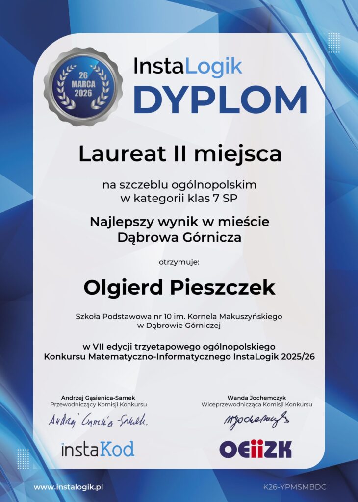 Olgierd Pieszczek z klasy 7a uzyskał tytuł Laureata II miejsca w VII edycji trzyetapowego ogólnopolskiego konkursu matematyczno-informatycznego InstaLogik 2025/2026.