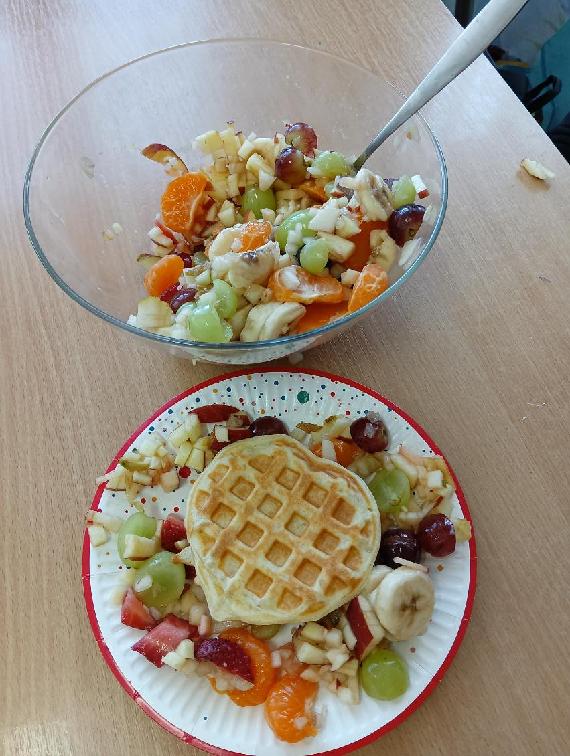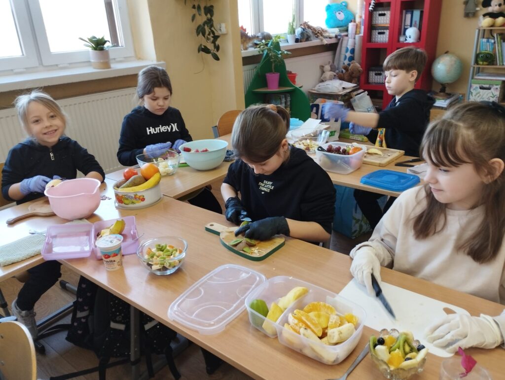 Kto powiedział, że nauka matematyki musi odbywać się tylko w ławce? Uczniowie klas drugich udowodnili, że liczby, miary i wagę najlepiej poznaje się… w kuchni! Za nami wyjątkowe zajęcia, podczas których zamieniliśmy zeszyty na fartuszki. Przygotowanie idealnego ciasta na gofry to nie lada wyzwanie! Dzieci musiały dokładnie odmierzyć składniki, pilnując proporcji i jednostek miary. Według przygotowanych przepisów, drugoklasiści samodzielnie przyrządzili witaminowe sałatki owocowe. Krojenie i dzielenie składników było świetną okazją do rozmów o zbiorach. Największą frajdę sprawiło nam pieczenie gofrów. Dlaczego wybraliśmy kształt serduszek? Ponieważ to idealny przykład osi symetrii! Dzieci mogły na własne oczy (i zęby) sprawdzić, jak jedna połowa idealnie pasuje do drugiej. Finałem zajęć była wspólna degustacja. Sałatka owocowa w towarzystwie chrupiących gofrów smakowała wyśmienicie, a matematyka okazała się… po prostu pyszna!