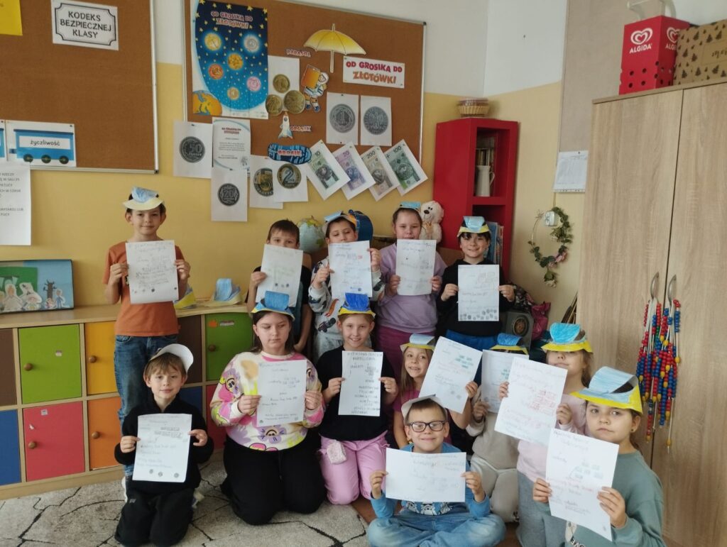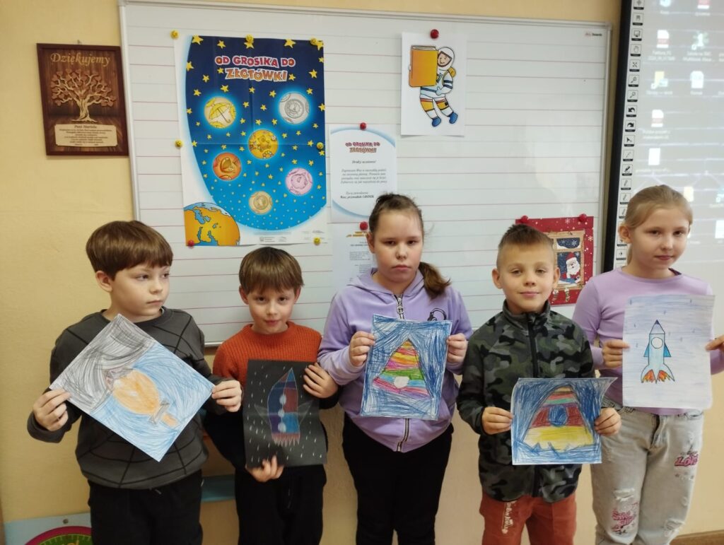 i bezpieczeństwa „Od grosika do złotówki”, którego organizatorem jest Fundacja Młodzieżowej Przedsiębiorczości. Projekt wzbogaca doświadczenia dzieci o wiedzę i umiejętności przydatne we współczesnym świecie jako początek edukacji ekonomicznej najmłodszych. Podróżując przez 10 miesięcy po galaktyce Finanse i Oszczędzanie dzieci będą poznawać: nominały i wartość pieniędzy, sposoby ich zarabiania, zasady racjonalnego ich wydawania, a także formy i sposoby oszczędzania. Uczniowie dowiedzą się także, że swoje bogactwo budują już teraz ucząc się i zdobywając nowe umiejętności, a także sprawdzając się w różnych formach aktywności. W styczniu dzieci wyruszyły na planetę Grosik, gdzie poznały pojęcia: moneta, banknot, awers, rewers, nominały monet i banknotów, mennica. Nauczyły się rozpoznawać i liczyć pieniądze. Rodzice zostali zaangażowani w realizację zadań przeprowadzając z dziećmi rozmowy na tematy: jak ważne są w życiu rodziny pieniądze i w jaki sposób je zabezpieczyć. W następną podróż wraz z Grosikiem wyruszymy na planetę Portfelik, która będzie poświęcona poznawaniu potrzeby i wartości pracy