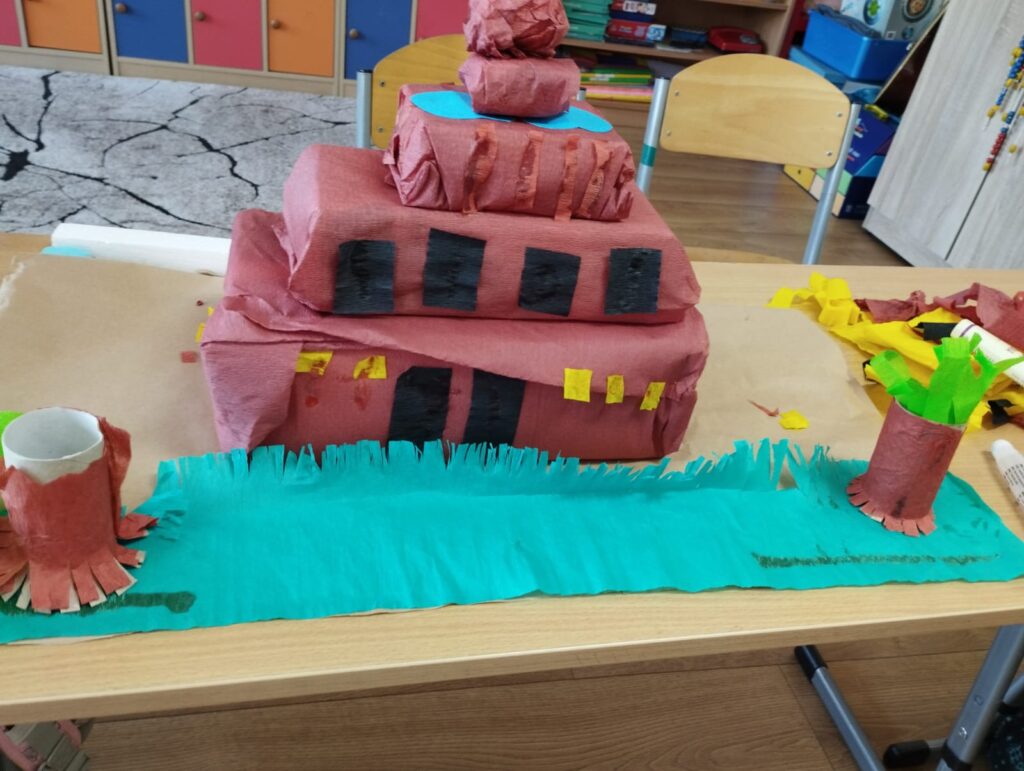 Największą atrakcją była jednak praca twórcza! Dzieci, pracując w grupach, przygotowały niesamowitą makietę naszego miasta. Znalazły się na niej „miejsca, które najbardziej lubimy” – na makiecie nie mogło zabraknąć Jeziora Pogoria, rozległego Parku Zielona, pełnego starych drzew i alejek spacerowych oraz przepływającej rzeki Przemszy, Pałacu Kultury Zagłębia, który jest sercem naszych miejskich wydarzeń oraz licznych ścieżek rowerowych, które dzieci znają z weekendowych wypraw.
